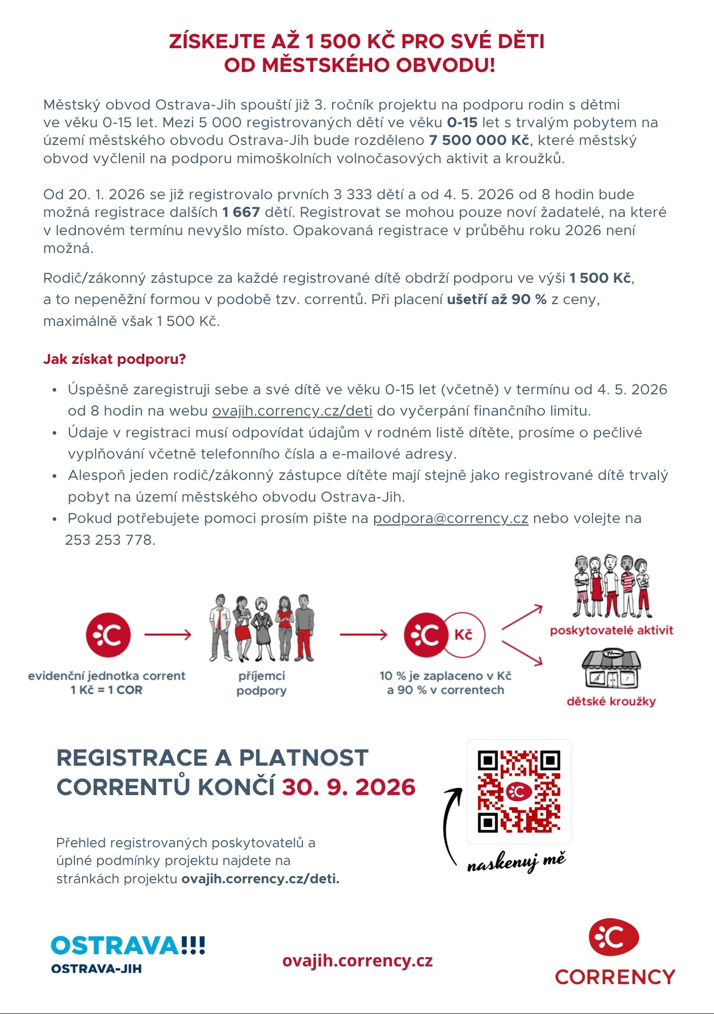 rádi bychom vám touto cestou sdělili, že dne 4. 5. 2026 od 8 hodin bude zahájena další registrace do projektu na podporu mimoškolních aktivit dětí s názvem CORRENCY DĚTI.